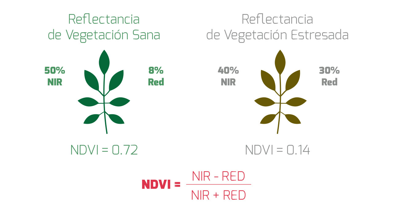 Un Índice de Vegetación puede ser definido como un parámetro calculado a partir de los valores de la reflectancia en la vegetación a distintas longitudes de onda. Es decir, que los cambios del índice de vegetación permiten analizar el estado de salud de la vegetación. El Índice de Vegetación Diferencial Normalizado (NDVI por sus siglas en inglés) permite identificar la presencia de vegetación verde en la superficie y caracterizar su distribución espacial así como la evolución de su estado a lo largo del tiempo. Esto está determinado fundamentalmente por las condiciones climáticas. Uno de los índices de vegetación más utilizados es el NDVI y se calcula mediante la siguiente expresión:
